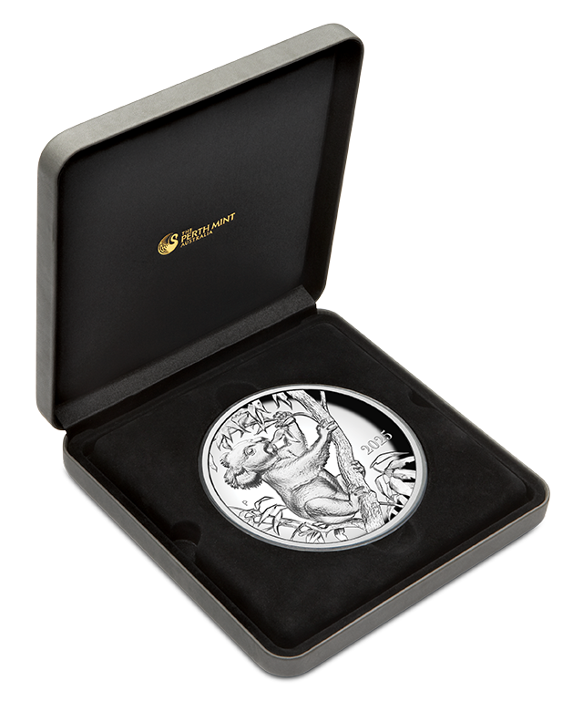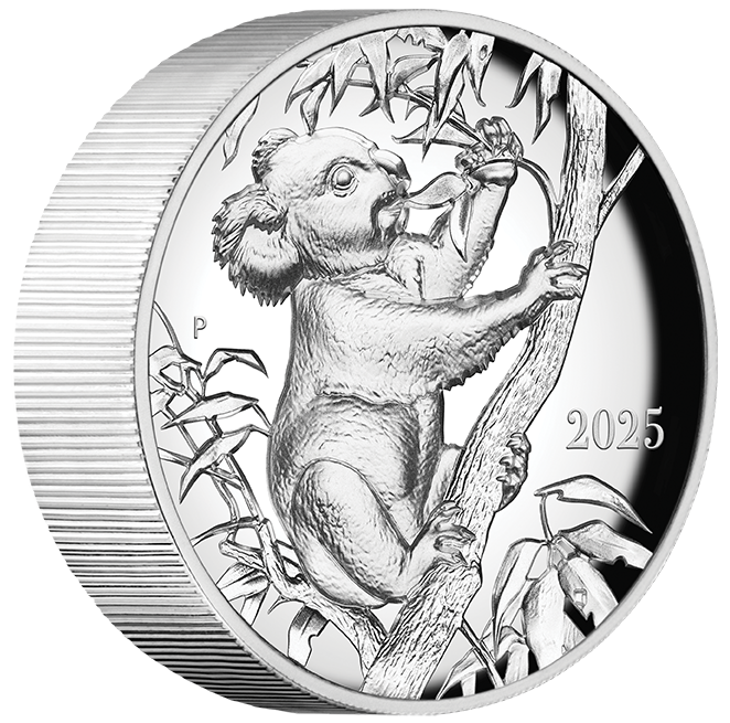 prehistoric animals in both traditional and digital media. The coin’s ultra high relief reverse portrays a koala sitting in a tree, happily eating eucalyptus foliage.