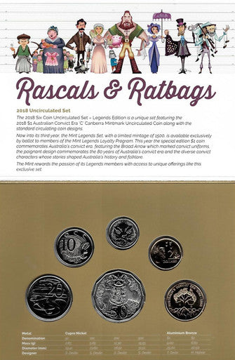 2018 Rascals & Ratbags Royal Australia Mint Legends Uncirculated Coin Set with $1 Australian Convict Era 'C' Mintmark Coin