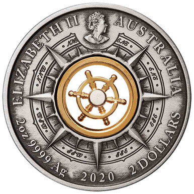 2020 $2 Voyage of Discovery Endeavour Rotating Helm 2oz Silver Antiqued Coin