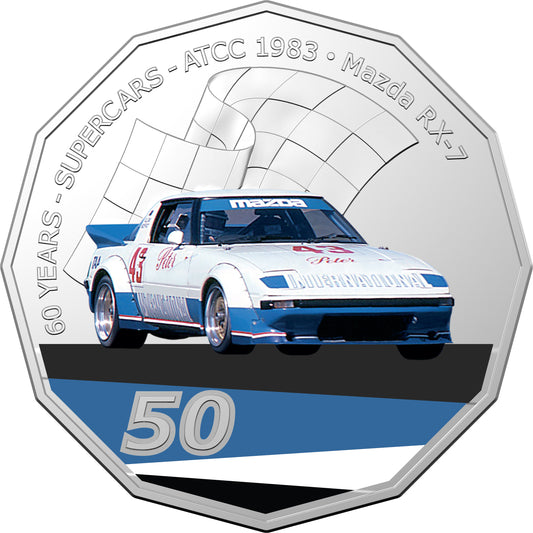 2020 50c 60 Years of Australian Supercars 1983 Mazda RX-7 Coloured Uncirculated Coin