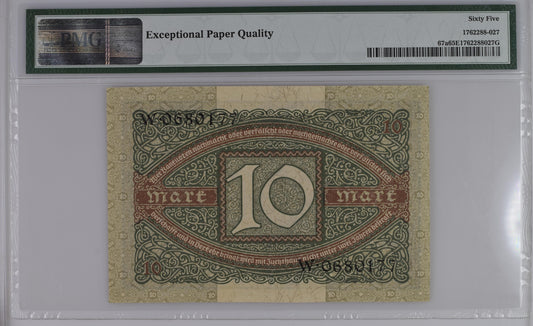 Germany 1920 Ten Mark Pick 67a Gem Uncirculated PMG 65 Banknote