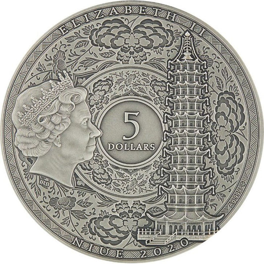 Niue 2020 $5 Famous Explorers Zheng He 2oz Silver with Porcelain Insert Antiqued Coin