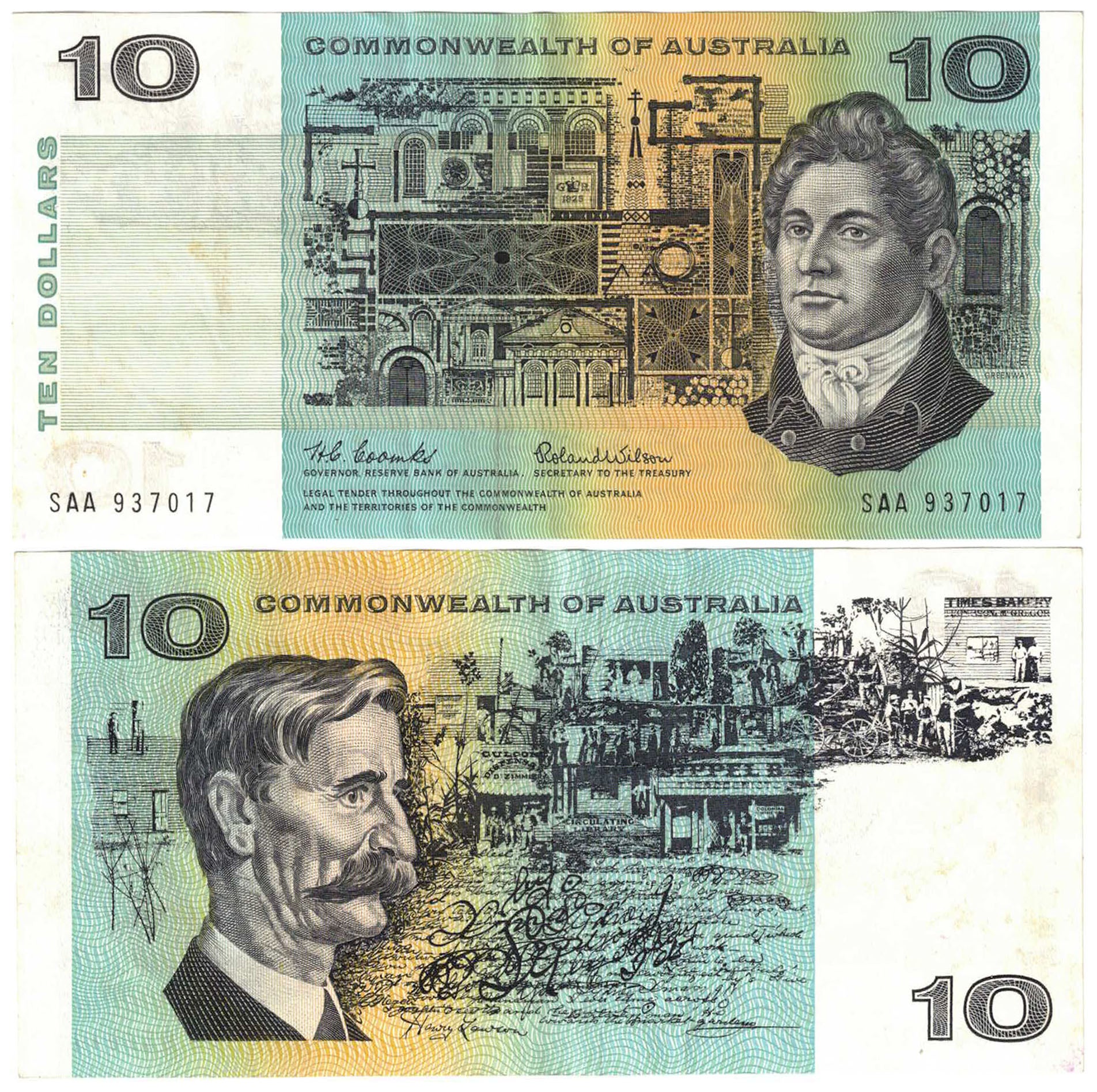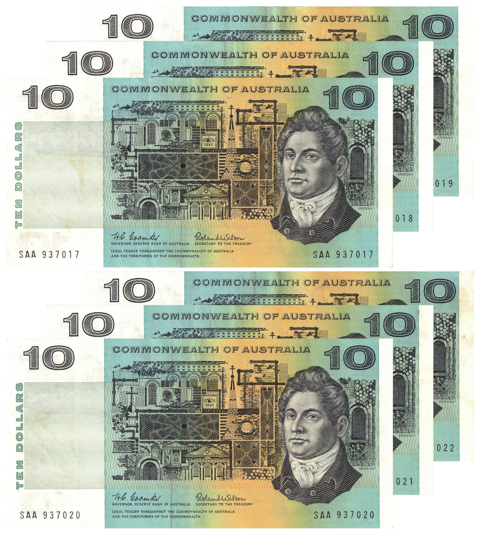 1966 $10 Coombs/Wilson R301F First Prefix SAA Extremely Fine Consecutive Run of 6 Banknotes