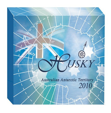 Husky is a general term for several breeds of dogs ideally adapted to hauling sleds in cold, snowy conditions. Originally from northern regions, huskies were introduced to the Antarctic by the British Antarctic Expedition of 1898 - 1900. The coin’s reverse depicts a team of huskies pulling sled with a coloured Antarctic sky in the background. The image, which also incorporates a coloured image of a husky and The Perth Mint's ‘P’ mintmark, appears within the shape of the Antarctic continent. The reverse includes the inscriptions 2010 - HUSKY, and ‘Australian Antarctic Territory’.