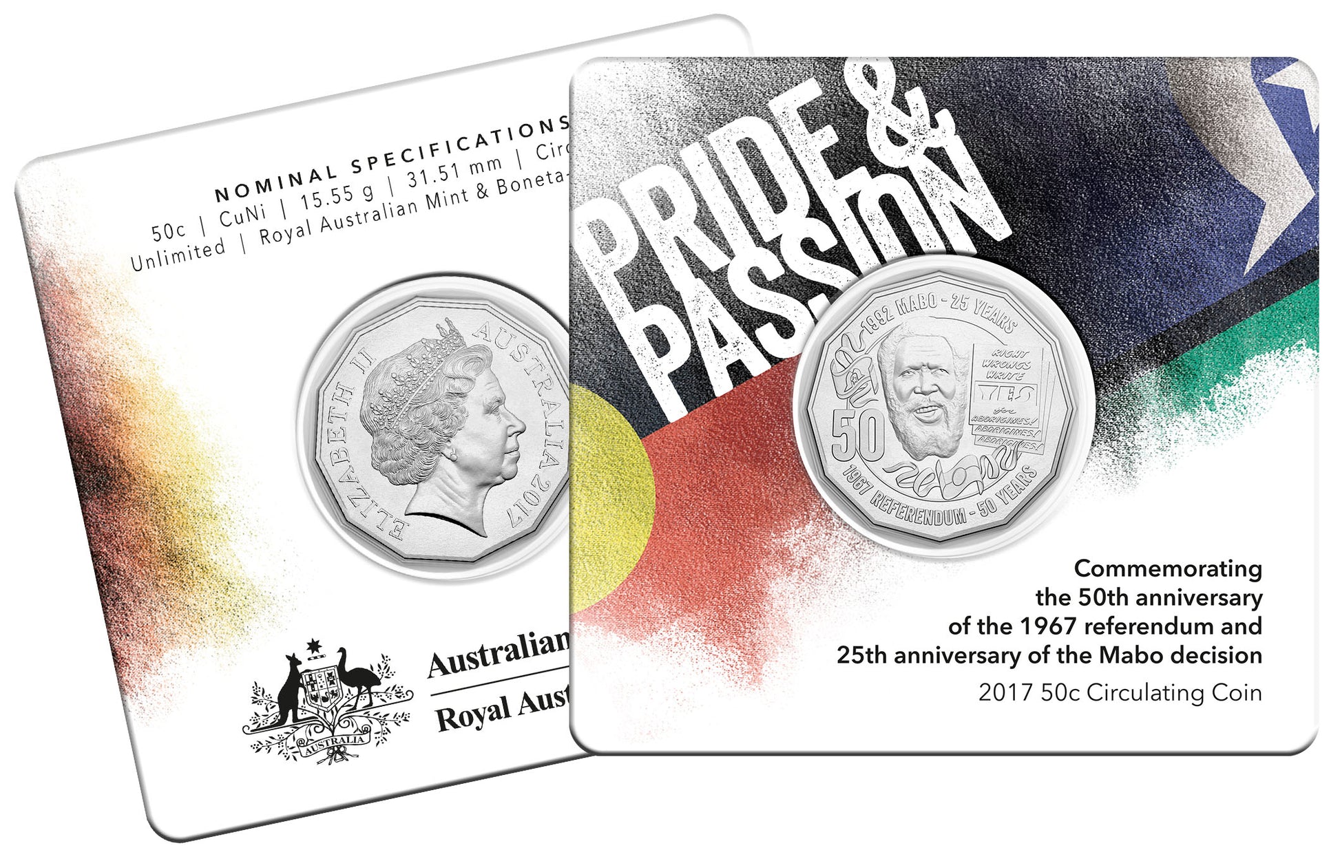 In National Reconciliation Week 2017, the nation celebrates the 50th anniversary of the 1967 referendum and 25th anniversary of the Mabo decision, which paved the way for native title - two landmark achievements for Indigenous Australians and symbolic turning points for Australia. To commemorate these two important anniversaries, The Royal Australian Mint is proud to have designed this coin in collaboration with Boneta-Marie Mabo, an award-winning contemporary artist and Eddie ‘Koiki’ Mabo's granddaughter.