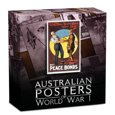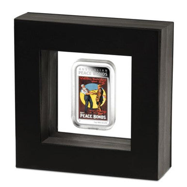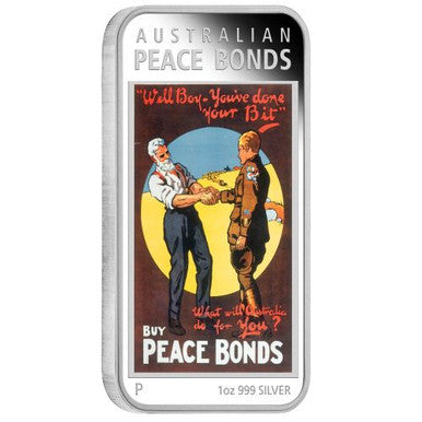 Following the end of the First World War, the Australian Government launched a series of ‘Peace Loan’ campaigns, which were managed by the Commonwealth Bank of Australia, with the aim of recouping the costs of the war and helping to fund the pensions of returned servicemen. The coin’s reverse features a coloured representation of the ‘Buy Peace Bonds’ poster headed by the inscription AUSTRALIAN PEACE BONDS and The Perth Mint’s traditional ‘P’ mintmark.