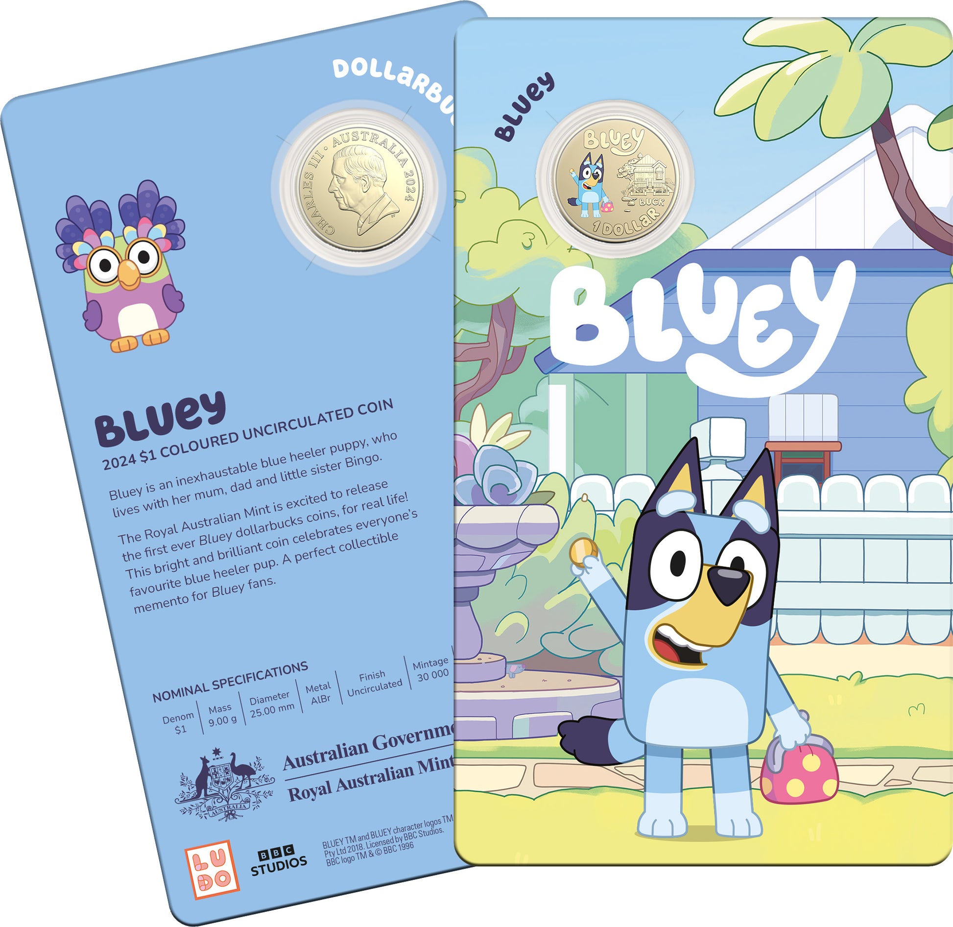 Bluey is an inexhaustible blue heeler puppy, who lives with her mum, dad and little sister Bingo. The Royal Australian Mint is excited to release the first ever Bluey dollarbucks coins, for real life! This bright and brilliant coin celebrates everyone’s favourite blue heeler pup. A perfect collectible memento for Bluey fans.