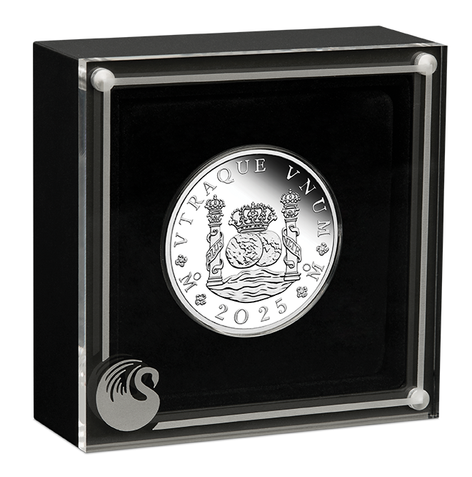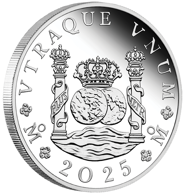 The coin’s reverse design pays homage to the Spanish Pillar Dollar, also known as a peso. Under the inscription ‘VTRAQUE VNUM’ (both are one), the coin portrays the Spanish Crown and two hemispheres representing the Old World and the New World. These elements are surrounded by representations of the Pillars of Hercules, both draped in spiralling banners displaying the words ‘PLVS VLTRA’ (more beyond). It has been suggested that the s-shaped configuration of the banners around the columns explain the origin of the ‘$’ sign. Included in the design is a unique ‘Mo’ mintmark, indicating the coins origin from Mexico City.