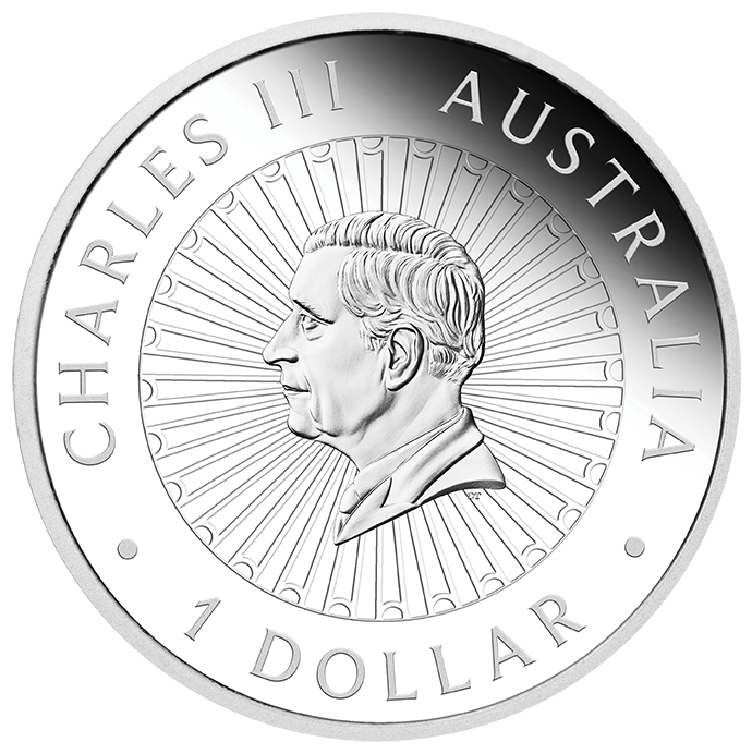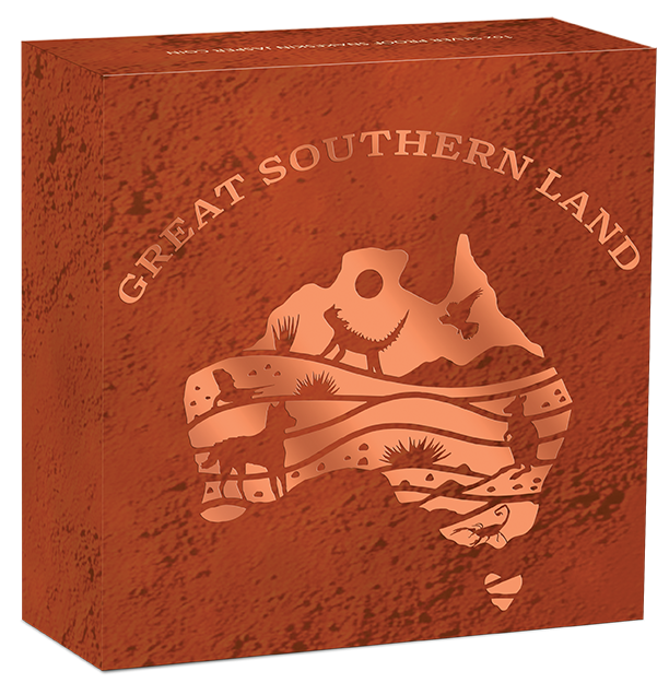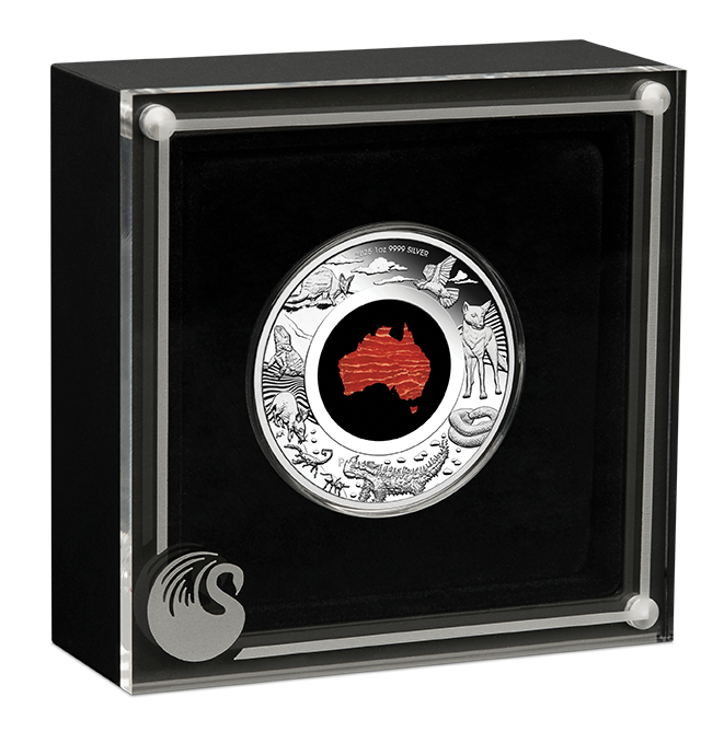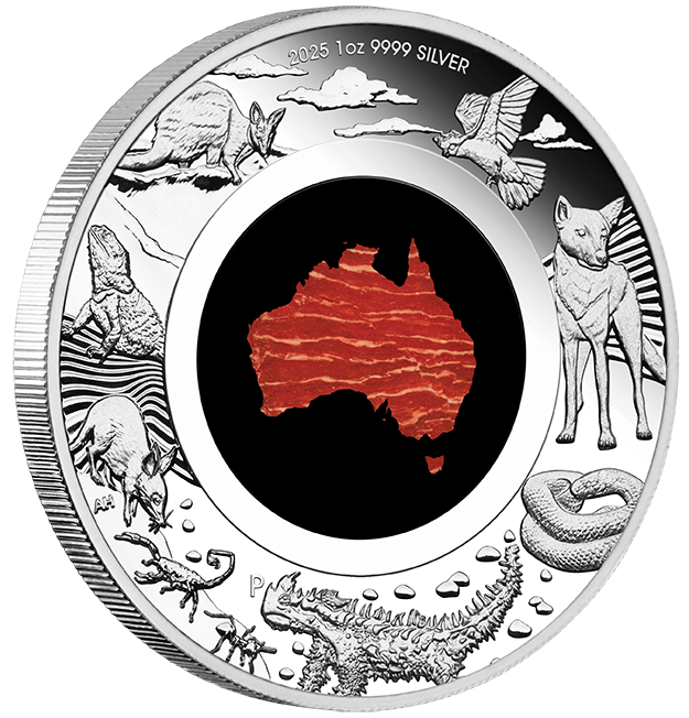 Celebrating Australia’s iconic desert species, the coin depicts (clockwise from top) a cockatoo, a dingo, a taipan snake, a thorny devil, a desert ant, a scorpion, a bilby, a bearded dragon, and a rock wallaby. Also in the design are representations of the sky, sand and rocks. The design encircles an Australia-shaped insert of snakeskin jasper, a red and white banded iron formation that occurs in the Pilbara, an outback mining area of Western Australia. Said to have calming and healing properties, snakeskin jasper takes a high polish which makes it an excellent choice for jewellery and ornamentation