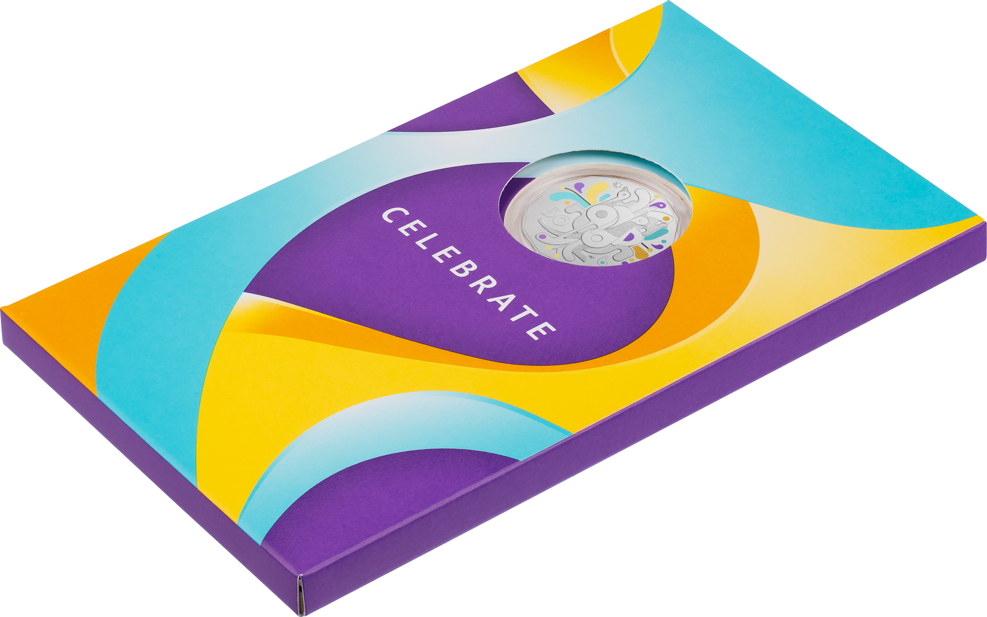 This colourful uncirculated coin is a playful modern twist on Stuart Devlin’s iconic 50c design bearing the Australian Coat of Arms. For years, the Royal Australian Mint had been helping people celebrate occasions and major life milestones with coins. Our new 50c Celebrate Coin is the perfect gift to moments worth celebrating. The design features a kangaroo and emu with celebratory ribbons. A modern twist to Australia’s 50c circulating design. The yellow dots represent our national floral emblem – wattle. The golden flowers have been on Australia’s Coat of Arms since 1912.