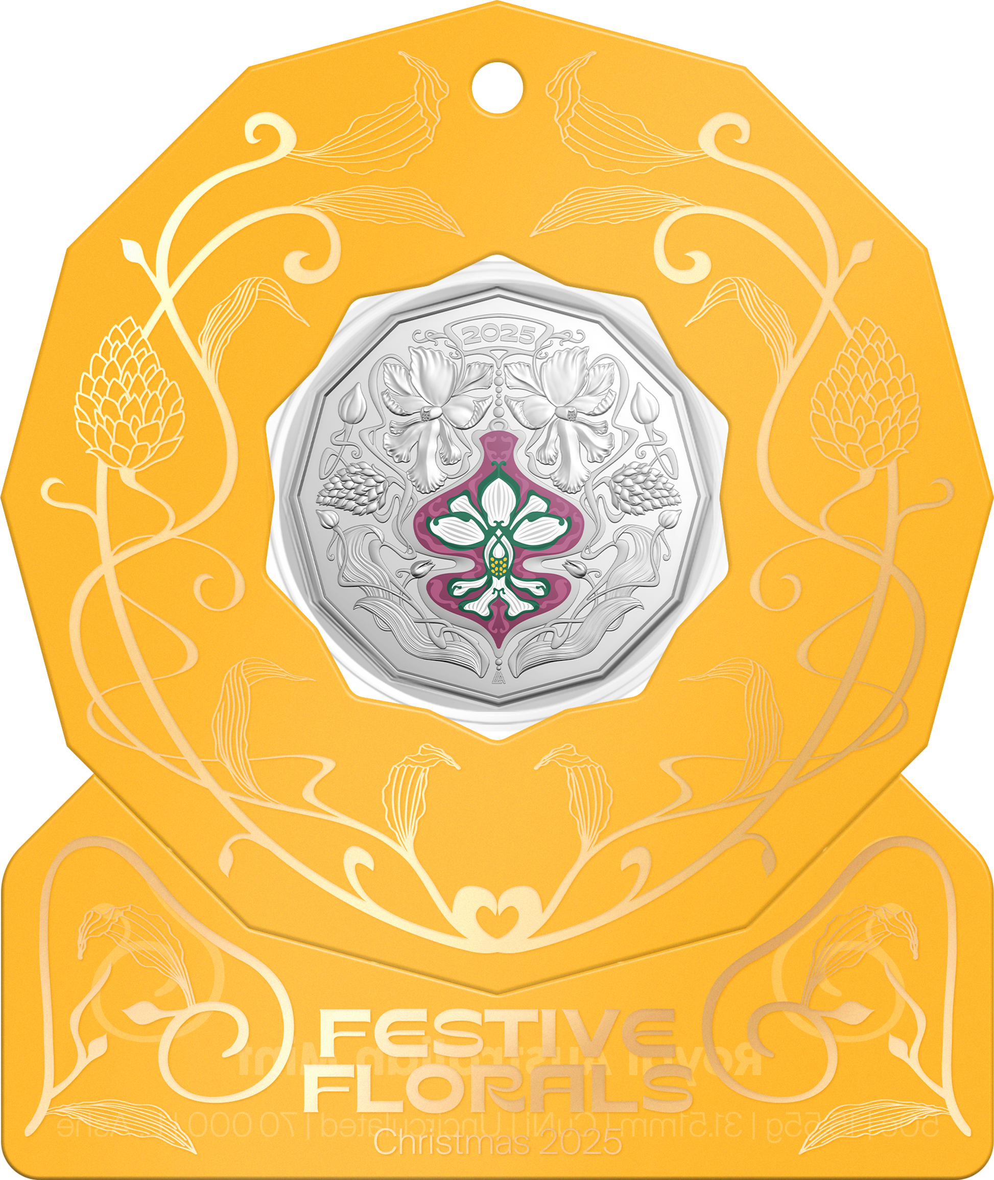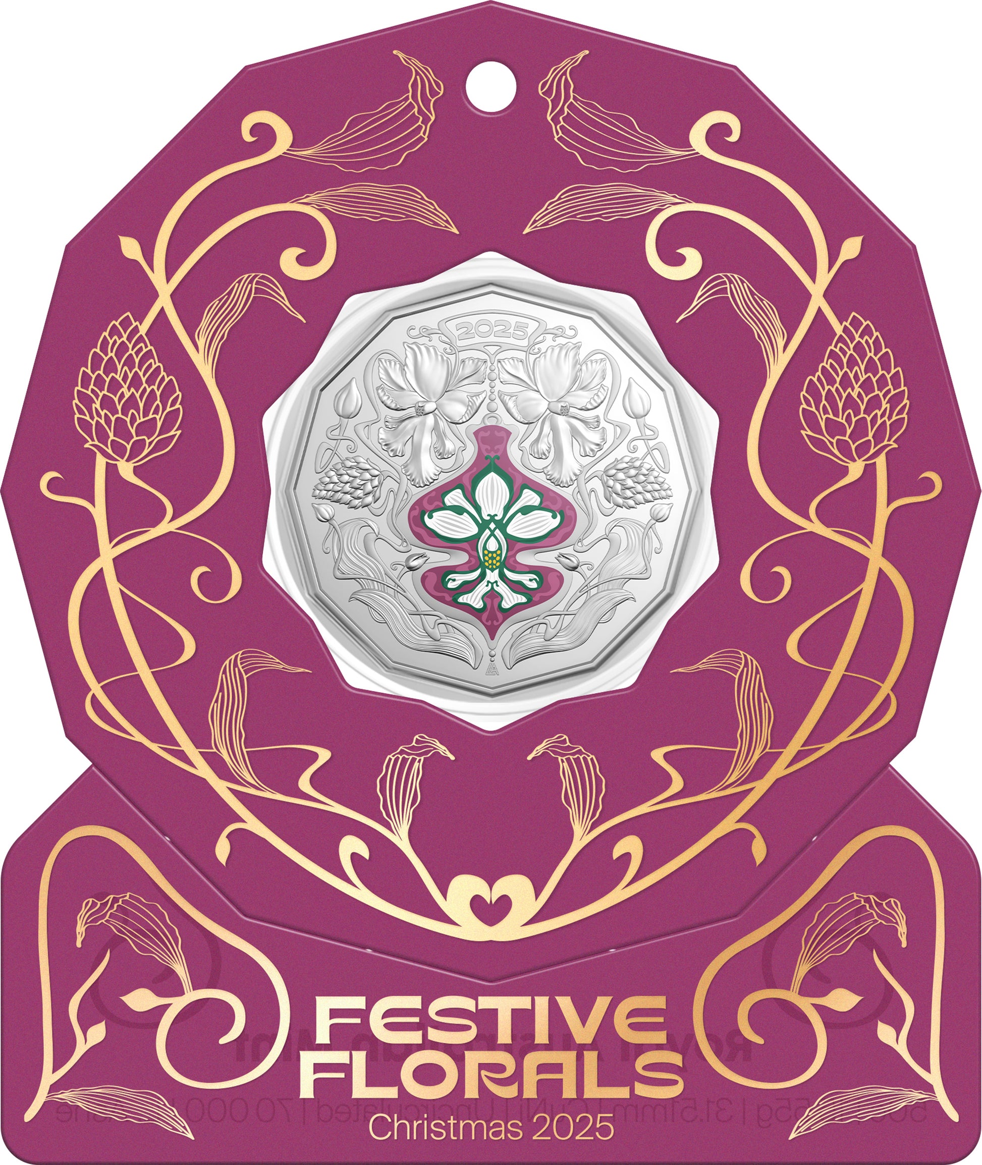 A number of native Australian plants that flower in December each year have traditionally been seen as heralds of the Christmas season. One of these is the elegant Queensland Christmas orchid - Calanthe triplicata. The design for this beautiful new 50c coin reimagines the Queensland Christmas orchid as an ornate bauble hanging amongst a riot of Art Nouveau floral embellishments. This is further enhanced by the hanging decoration card available in five translucent colours, gilded with gold foil accents.