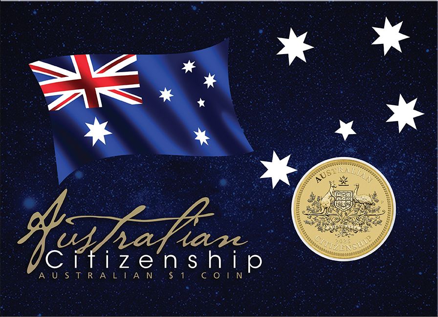 Australian citizenship symbolises our unity as a nation. It represents a commitment to Australia and its people, the values we share and our common future. For anyone who has made the citizenship. The Coat of Arms on the reverse of the coin consists of the badges of six States of the Commonwealth on a shield enclosed by an ermine border signifying Australian Federation in 1901. The crest of the Arms, including a seven-pointed star, appears above the shield, which is supported by a kangaroo and an emu, which are native Australian animals. The Coat of Arms represents the federation of the states and the unique wildlife of Australia.
