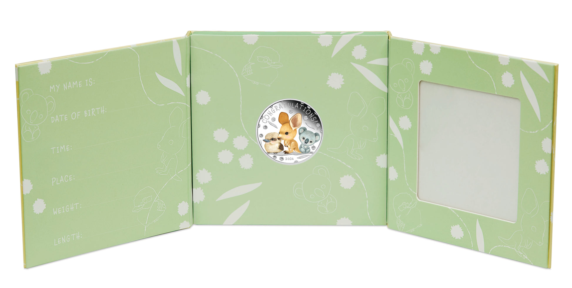 This delightful release represents the perfect keepsake that doting parents will treasure on behalf of their bundle of joy. The coloured coin depicts illustrations of Australia's beloved baby animals including a fluffy young kangaroo, a playful kookaburra, and a cuddly koala. Included in the design are representations of eucalypt leaves and spiky seed pods, as well as the inscription ‘CONGRATULATIONS!’ and The Perth Mint’s ‘P’ mintmark. The coin is housed in an illustrated folding card that offers room to write the baby’s details and a place to house a photograph, making it a beautiful keepsake.