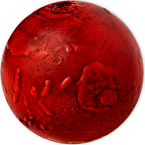 Barbados now turns its attention the mysterious Red Planet. This sphere shaped coin displays a depiction of Mars with the planet’s unmistakable red hue achieved through an antiqued finish with red spray colouring. The antiqued finish gives this coin an appearance of Mars as if you were viewing it in space. To achieve this effect, the spherical shape was cast and polished manually. The antiqued finish was then added and then sprayed with red colouring. Before the colour was completely dry, some of it was rubbed away by hand so that the antiqued layer underneath shines through. Finally, the Barbados Coat of Arms was applied through a highly innovative “Water Transfer Print.”