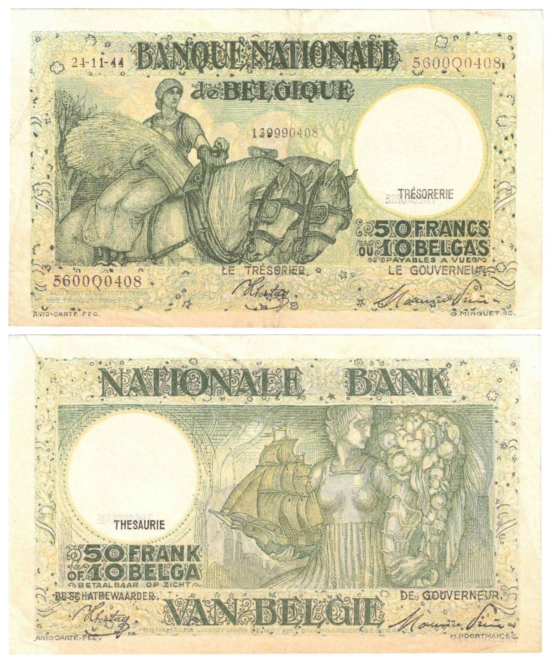 Belgium 1944 Fifty Francs #106 About Uncirculated Banknote