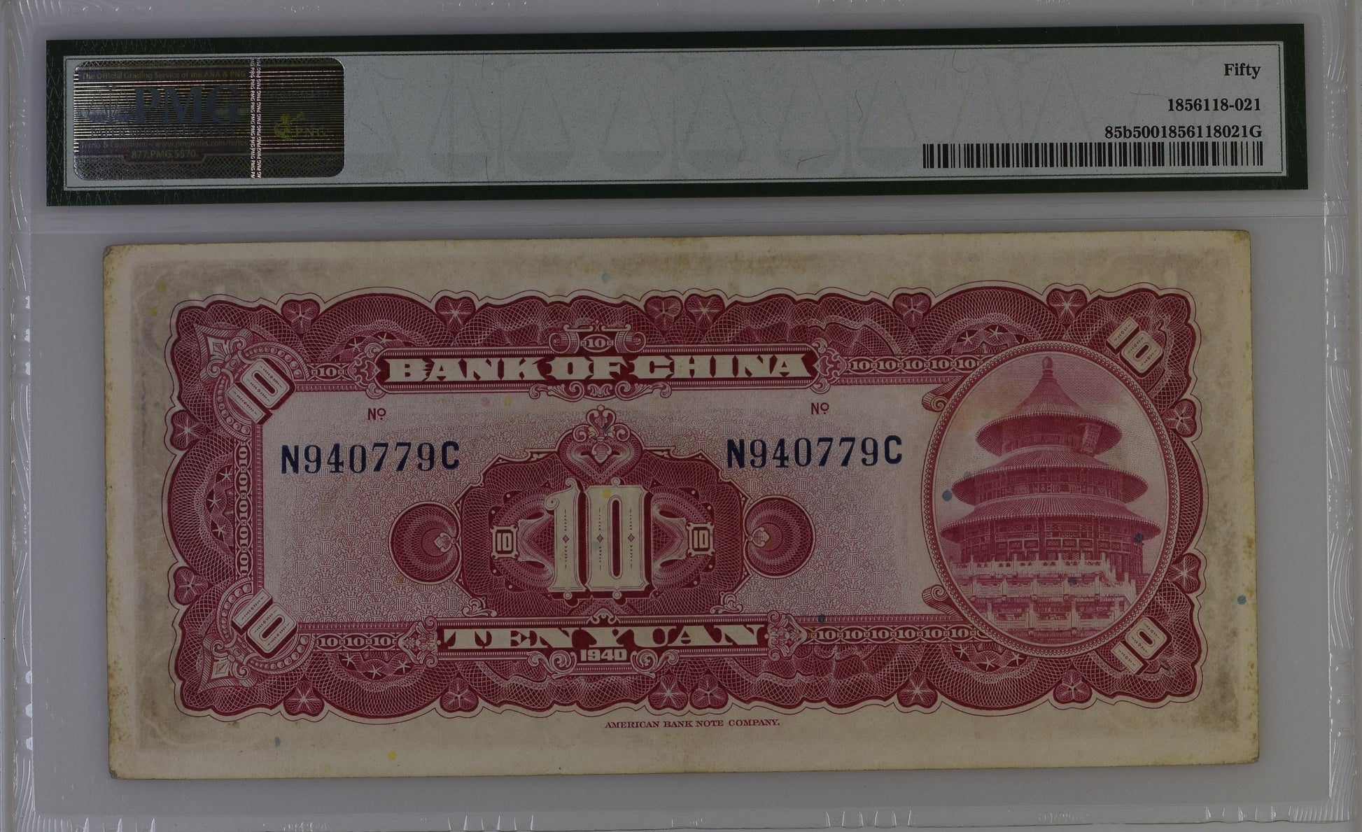 Paper Money Guaranty (PMG) China, Bank of China S/N N940779C - Printer: ABNC - S/N on Front & Back.