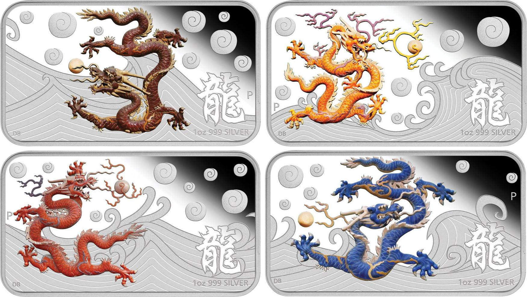 Cook Islands 2012 $1 Lunar Calendar Year of The Dragon 1oz Silver Coloured Proof Rectangle Shaped 4 Coin Set