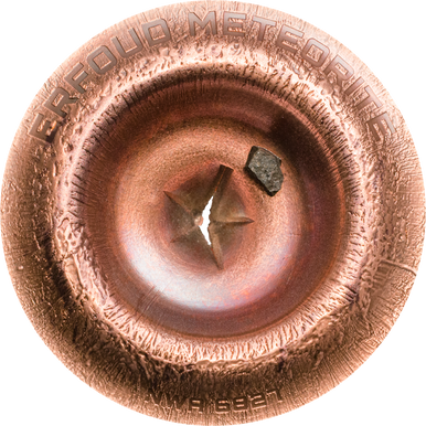 Fully copper-plated and partially coloured. Featuring an original piece of the meteorite Northwest Africa 6827. The authority of the Government of the Cook Islands certifies that this coin is legal tender of the Cook Islands. This coin is guaranteed by the mint to match the fineness and weight as set in the specifications.