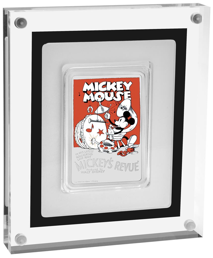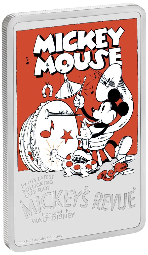 Mickey’s Revue is a black and white Disney cartoon released on 25 May 1932. As the name suggests it starred Mickey Mouse, but it is notable for the first appearance of the character who would become Goofy - shown as a member of the audience cheering on Mickey’s musical comedy. This unique, rectangular coin features a replica image of the 1930’s poster for the Disney cartoon Mickey’s Revue. The design incorporates both colour and engraving to great effect.