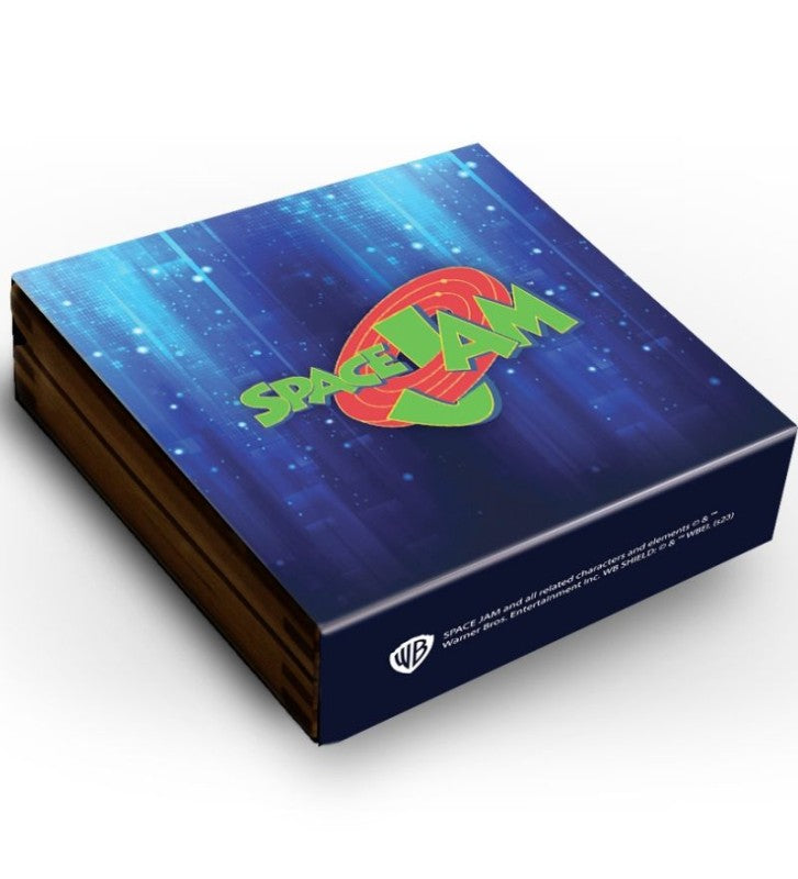 Play a space basketball game with the heroes of Space Jam! Bugs Bunny is waiting for you, will you accept the challenge? The reverse side features the image of 3 characters: Bugs Bunny, Monstar Blanko and Monstar Pound. On the same side of the coin is a stamp with the logo of the movie Space Jam, which is an iconic symbol of this popular production. The word "Space Jam" is written in a distinctive futuristic style, adding additional unique charm to the coin, in addition, the logo itself is done in fluorescence. The whole piece is made in high relief with UV printing which adds prestige and elegance. The obverse of the coin depicts a basketball court, where an exciting game is taking place. We can see the outline of the players in full stride.