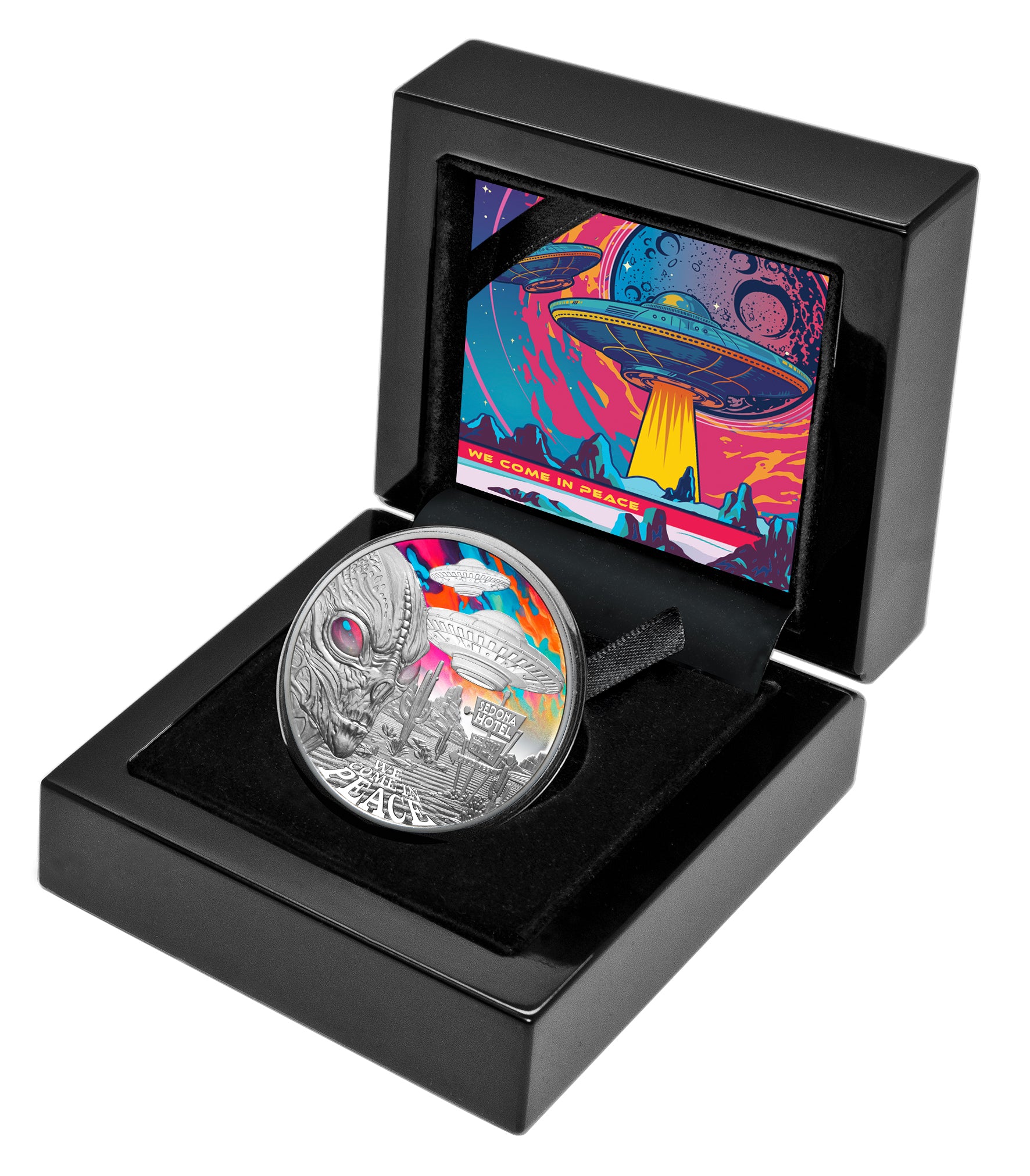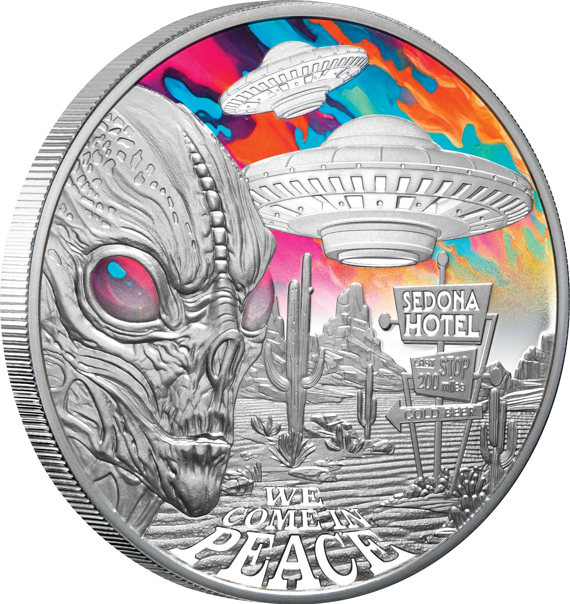 This psychedelic ‘out of this world’ silver coin reveals the mysterious and unexplained phenomenon of UFO’s at one of the most active sighting zones in the Arizona desert town of Sedona, USA.