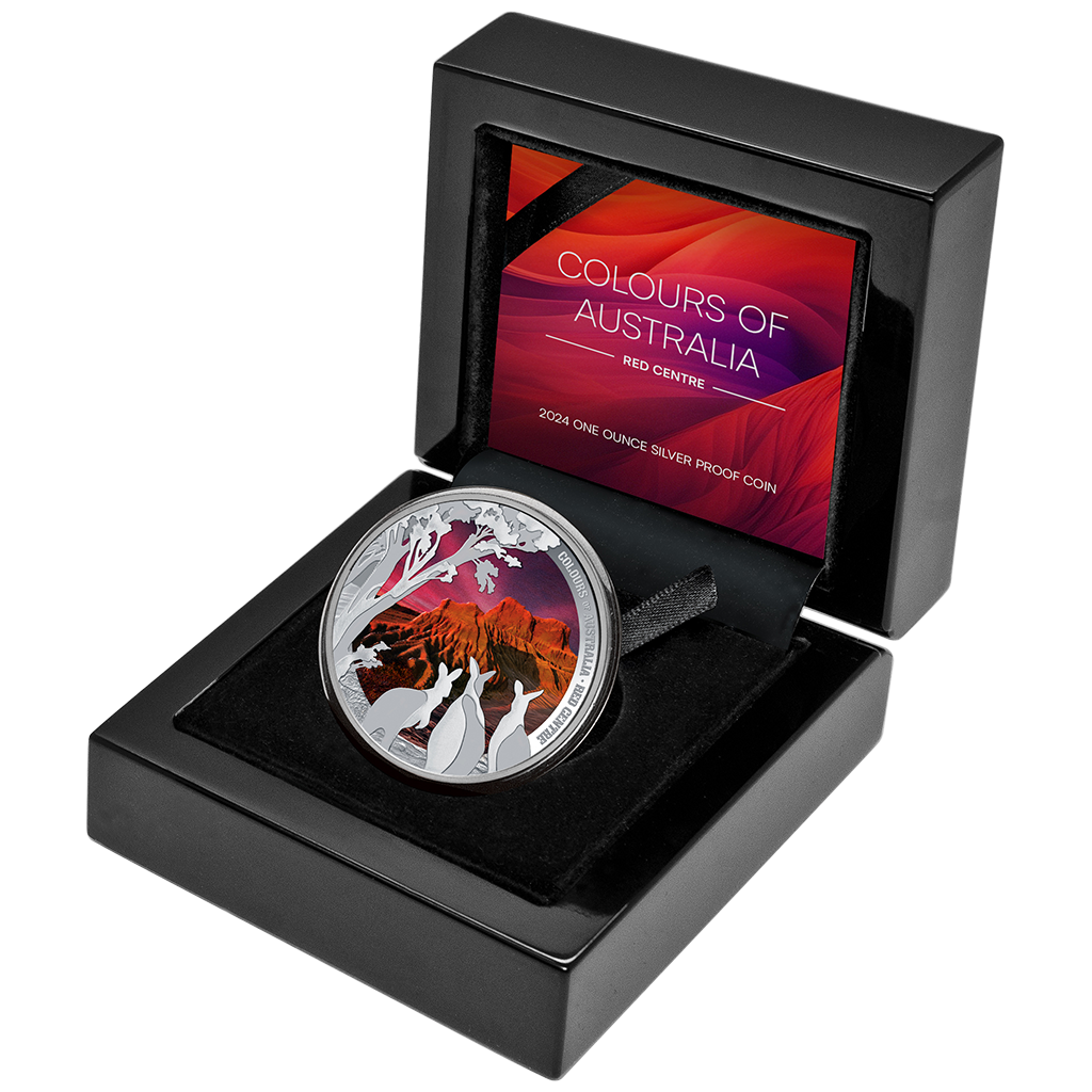 Illuminating natures artistry, the Red Centre of Australia showcases a breathtaking display of crimson hues painting extraordinary desert landscapes. This vibrant masterpiece embodies a fusion of brilliant colour, and a meticulously crafted design encapsulated within one ounce of pure silver.
