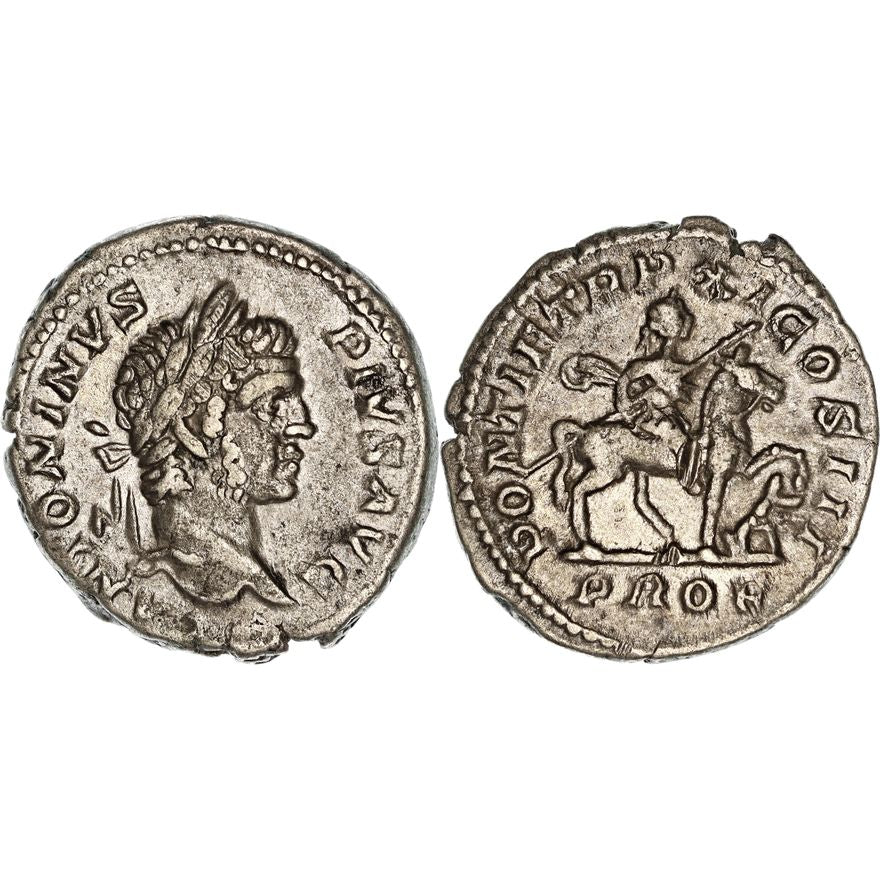 ROMAN IMPERIAL, SEVERAN, Caracalla (as Augustus 198-217 AD), Silver Denarius (3.55g, 18mm), Rome mint 208 AD. Obv. Laureate head right, with adolescent features, "ANTONINVS PIVS AVG". Rev. Caracalla, in military attire, on horseback advancing right, enemy kneeling to right, "PROF" in exergue, "PONTIF TR P XI COS III". RIC 108; RSC 510. Reverse mark, nice type, toned, Very Fine / near Very Fine.