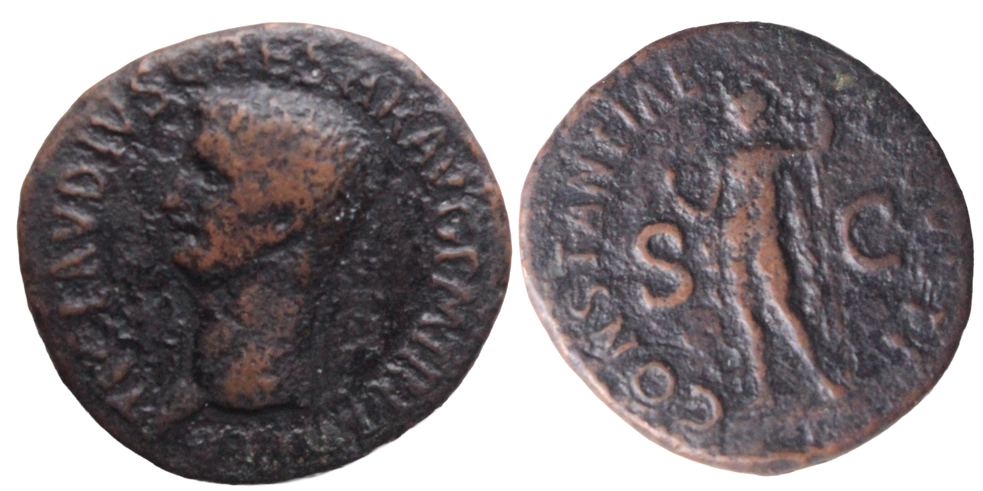 Rome, 42-43. Obv: TI CLAVDIVS CAESAR AVG P M TR P IMP P P Bare head of Claudius to left. Rev: CONSTANTIAE AVGVSTI / SC Constantia, helmeted and in military dress, standing front, head to left, raising her right hand and holding scepter in her left. RIC 111 Fine