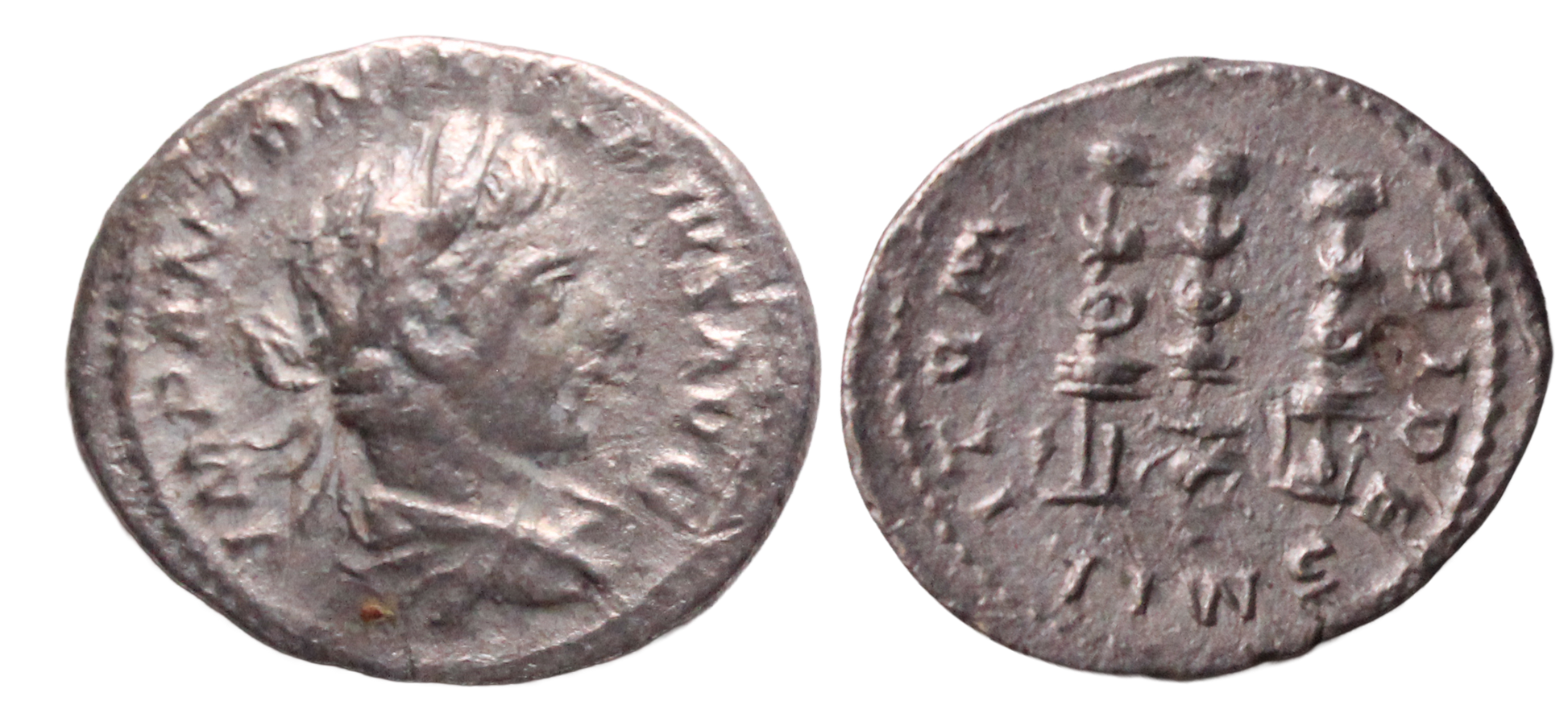 Rome 218-222AD, Obv: IMP ANTONINVS PIVS AVG Bust of Elagabalus, laureate, draped, right. Rev: FIDES MILITVM Legionary eagle perched between two standards with one or two shields at the foot of each standard. RIC IV 78