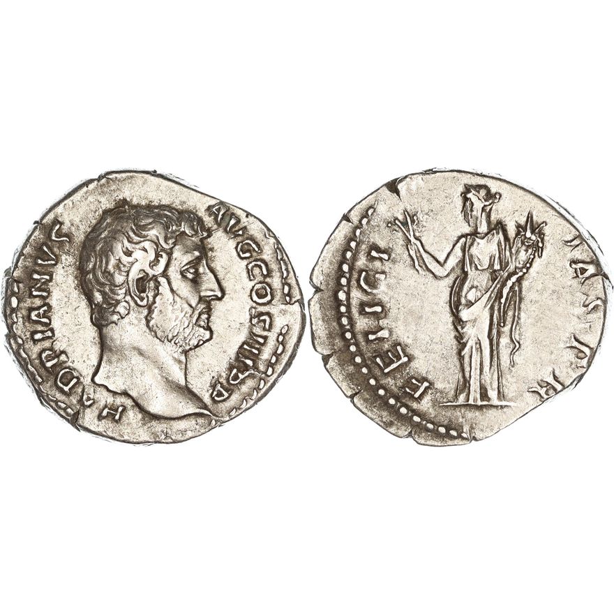 ROMAN IMPERIAL, NERVA-ANTONINE, Hadrian (117-138 AD), Silver Denarius (3.16g, 17mm), Rome mint 134-138 AD. Obv. Bare head right, "HADRIANVS AVG COS III PP". Rev. Felicitas stands left, "FELICITAS P R". RIC 238; RSC 649. Handsome portrait, Very Fine.