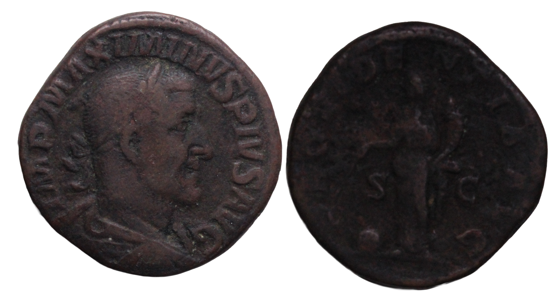 Rome 235-236AD Obv: IMP MAXIMINVS PIVS AVG Bust of Maximinus I, laureate, draped, cuirassed, right. Rev: PROVIDENTIA AVG S C Providentia, draped, standing left, holding wand in right hand over globe decorated with stars and zones and set on ground and holding cornucopiae in left hand