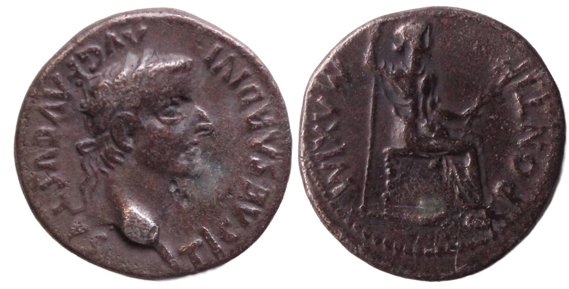Obv: TI CAESAR DIVI AVG F AVGVSTVS: Head of Tiberius, laureate, right Rev: PONTIF MAXIM: Female figure, draped, right, seated, right holding branch and inverted spear, on chair with ornamented legs; below chair, a triple line.