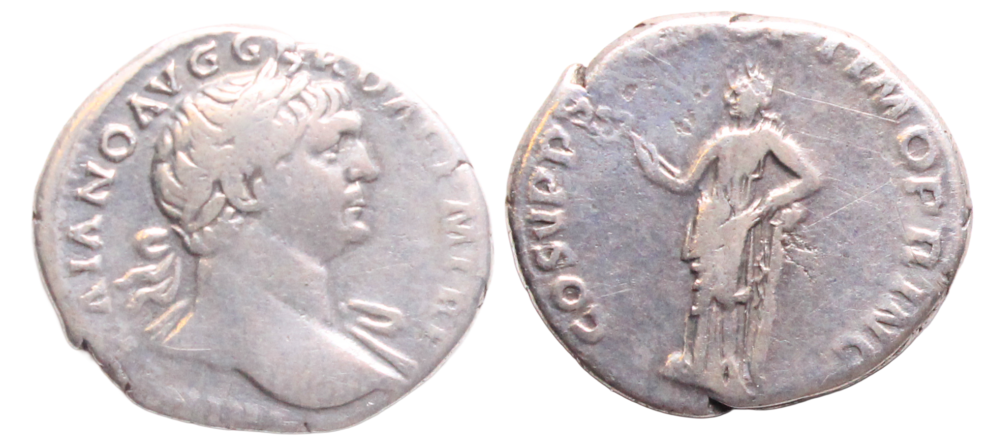 Obv: IMP TRAIANO AVG GER DAC P M TR P: Bust of Trajan, laureate, draped on left shoulder, right. Rev:COS V P P S P Q R OPTIMO PRINC: Felicitas, draped, standing left, holding caduceus in right hand and resting left arm on column.