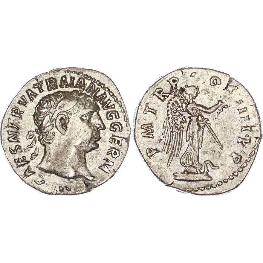 ROMAN IMPERIAL, NERVA-ANTONINE, Trajan (the Optimus Princeps, 98-117AD), Silver Denarius (3.35g, 19mm), Rome mint 102 AD. Obv.Laureate head right, "IMP CAES NERVA TRAIAN AVG GERM". Rev. Victory stands right on prow of galley, "PM TR P COS IIII PP". RIC 51; RSC 249. Well centred, Very Fine to good Very Fine.