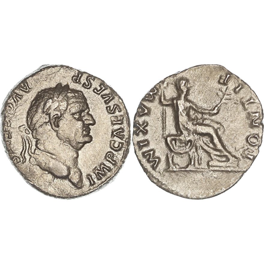 ROMAN IMPERIAL, FLAVIAN, Vespasian (69-79 AD), Silver Denarius (2.89g, 18mm), Rome mint 73 AD. Obv. Laureate head right, "IMP CAES VESP AVG CENS". Rev. Vespasian seated right, "PONTIF MAXIM". RIC 546; RSC 387. Porous surfaces, near Very Fine.