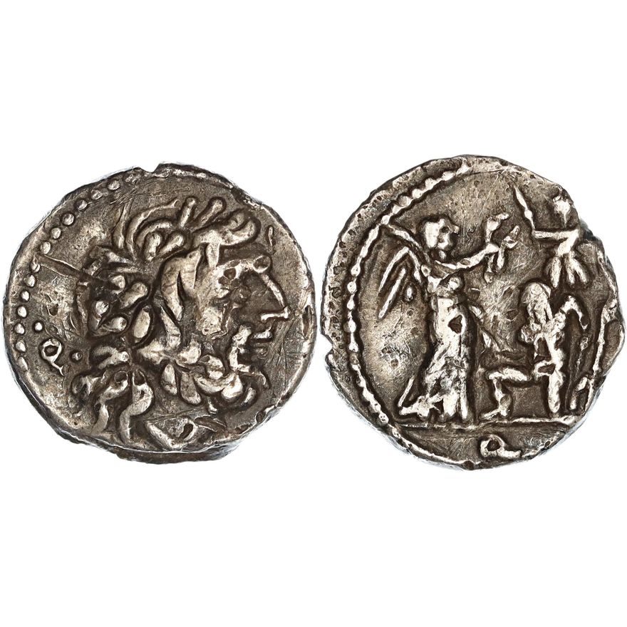 ROMAN REPUBLIC, C. Fundanius, as Triumvir Monetalis (moneyer), Silver Quinarius (1.96g, 14mm), Rome mint 101 BC. Obv/ Laureate head of Jupiter right, control mark "Q" to left. Rev. Victory stands right, holding palm branch and crowning trophy of arms, carnyx and captive kneeling left by trophy's base, "C· FVNDA" to right, "Q" in exergue. Crawford 326/2; Sydenham 584. Marks and hairlines, a far less often seen denomination for the period, Very Fine / near Very Fine.