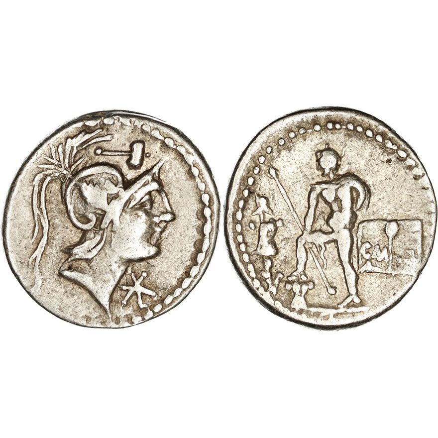 ROMAN REPUBLIC, C. Publicius Malleolus, as Triumvir Monetalis (moneyer), Silver Denarius (3.85g, 20mm), Rome mint 96 BC. Obv. Head of Mars right, with youthful features, wearing plumed helmet, mallet above, "X-" monogram (mark of value) to lower right. Rev. Heroic figure stands left, foot on cuirass, holding spear and leaning on tabella inscribed "C MAL", trophy of arms to left. Crawford 335/3f; Sydenham 810. A charming obverse, lightly toned, Very Fine / good Fine.
