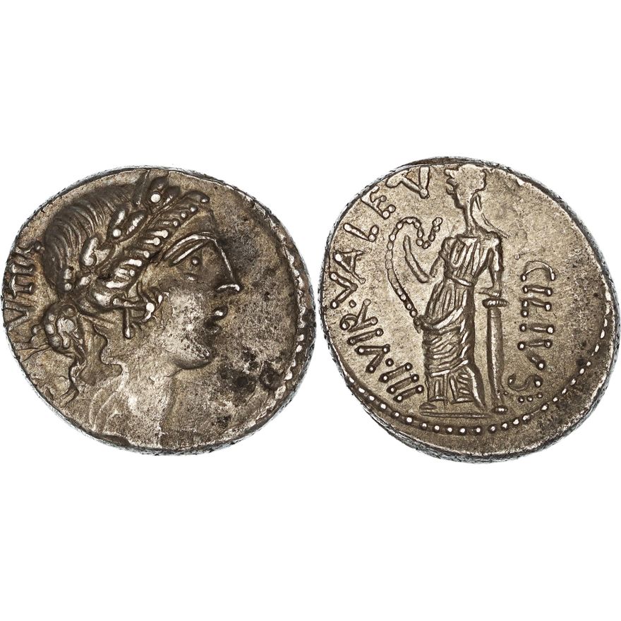 ROMAN REPUBLIC, Mn. Acilius Glabrio, as Triumvir Monetalis (moneyer), Silver Denarius (3.90g, 17mm), Rome mint 49 BC. Obv. Laureate head of Salus right, "SALVTIS" to left. Rev. Salus stands left, holding serpent, "MN· ACILIVS·" to right, "III·VIR VALETV" to left. Crawford 442/1a; Sydenham 922. Some flatness of strike and staining, reverse sharp, Very Fine / good Very Fine.