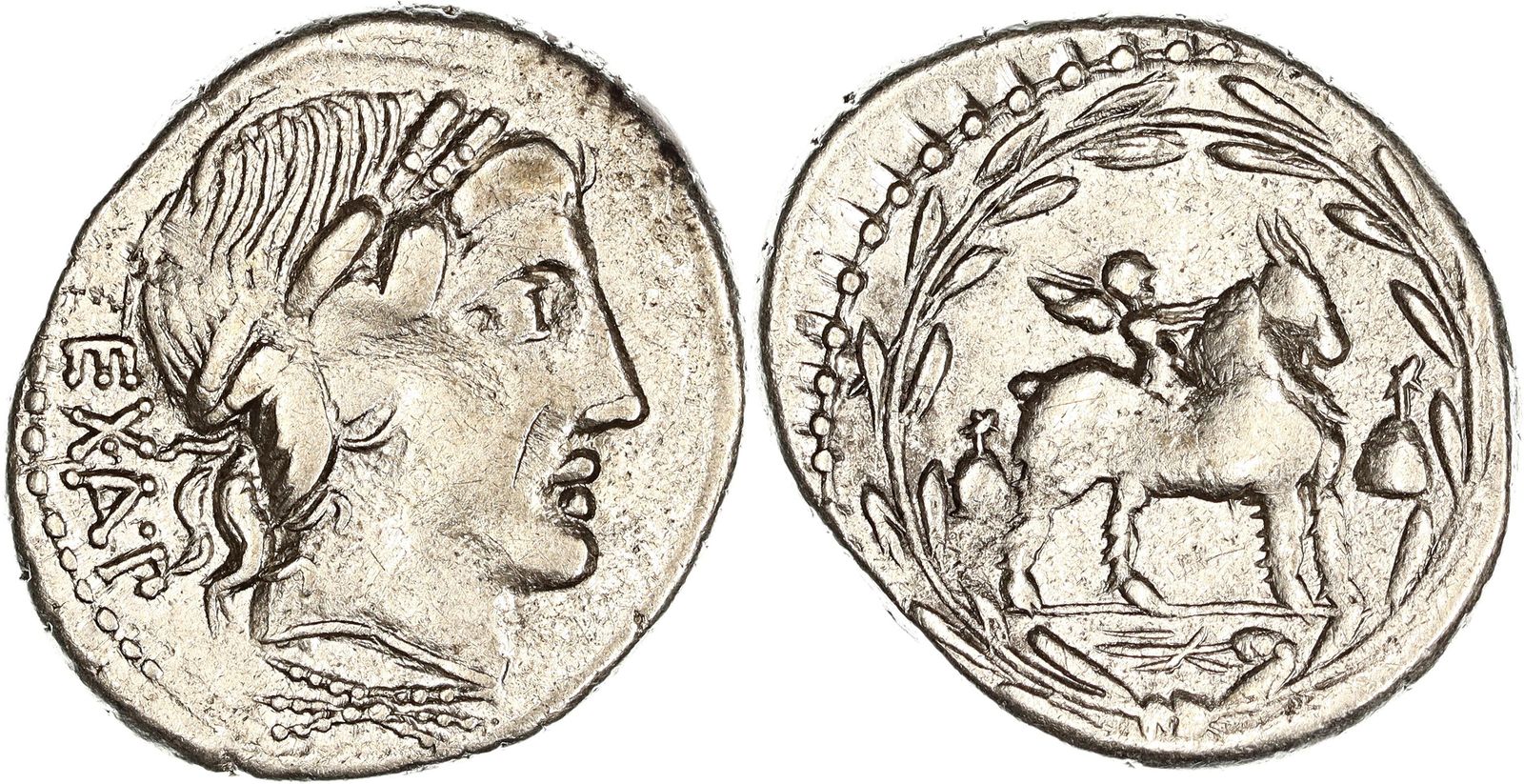 ROMAN REPUBLIC, Mn. Fonteius C.f., as Triumvir Monetalis (moneyer), Silver Denarius (3.82g, 17mm), Rome mint 85 BC. Obv. Laureate head of Apollo Vejovis right, "ROMA" monogram to lower right, "EX A·P" to left, thunderbolt below. Rev. Infant Genius rides goat right, Dioscuri's caps to left and right, filleted thyrsos below, all within laurel wreath. Crawford 353/2; Sydenham 726. Near Very Fine.