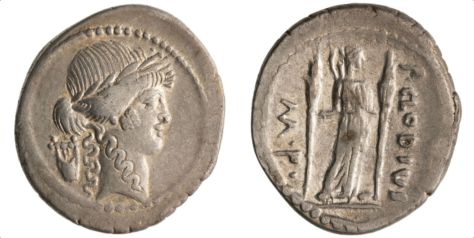 ROMAN REPUBLIC, Claudia, Silver Denarius, Rome mint 42 BC. Obv. Apollo. Rev. Diana Lucifera holding torches, Very Fine.