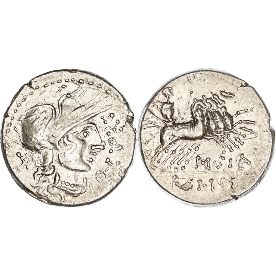 ROMAN REPUBLIC, Q. Curtius & M. Iunius Silanus, as Triumviri Monetale (moneyers), Silver Denarius (3.96g, 20mm), Rome mint 116-115 BC. Obv. Head of Roma right, wearing winged Attic helmet, "X" (mark of value) to left, "Q· CVRT" to right. Rev. Jupiter commands quadriga right, lituus bove, "M· SILA" (LA ligate) below, "ROMA" in exergue. Crawford 285/2; Sydenham 537. Some reverse flan flaws and slightly rusty die, Very Fine.