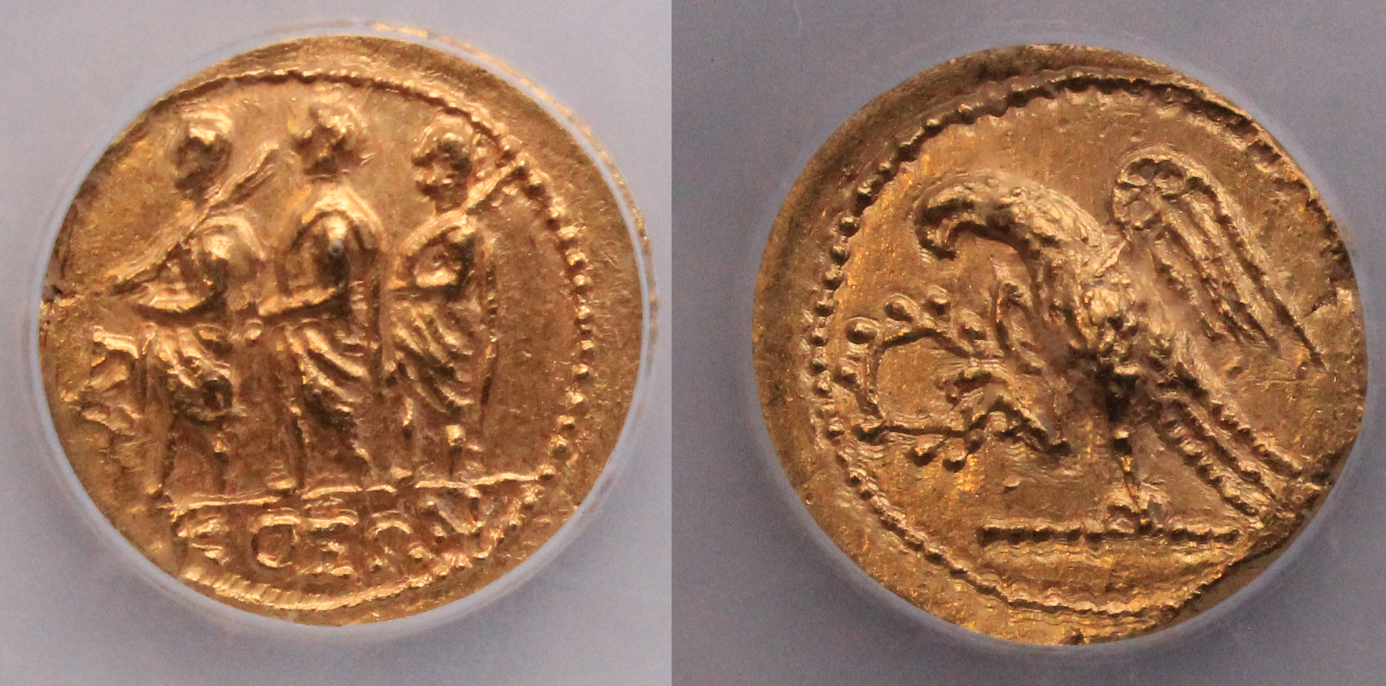 Thrace, Kingdom of Koson 44-42BC Gold stater, Northern Greece mint, Obv. three figures advancing to left, the first and third carrying an axe over left shoulder, KOSWN in exergue, Brutus's monogram to left, Rev. eagle standing to left on sceptre, holding wreath in one claw, S.1733