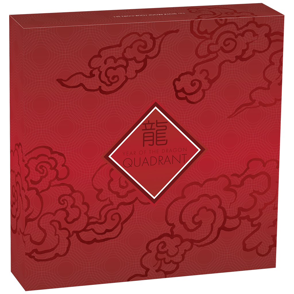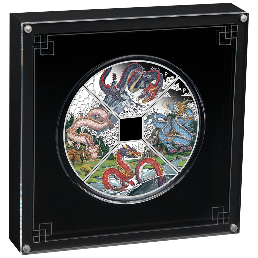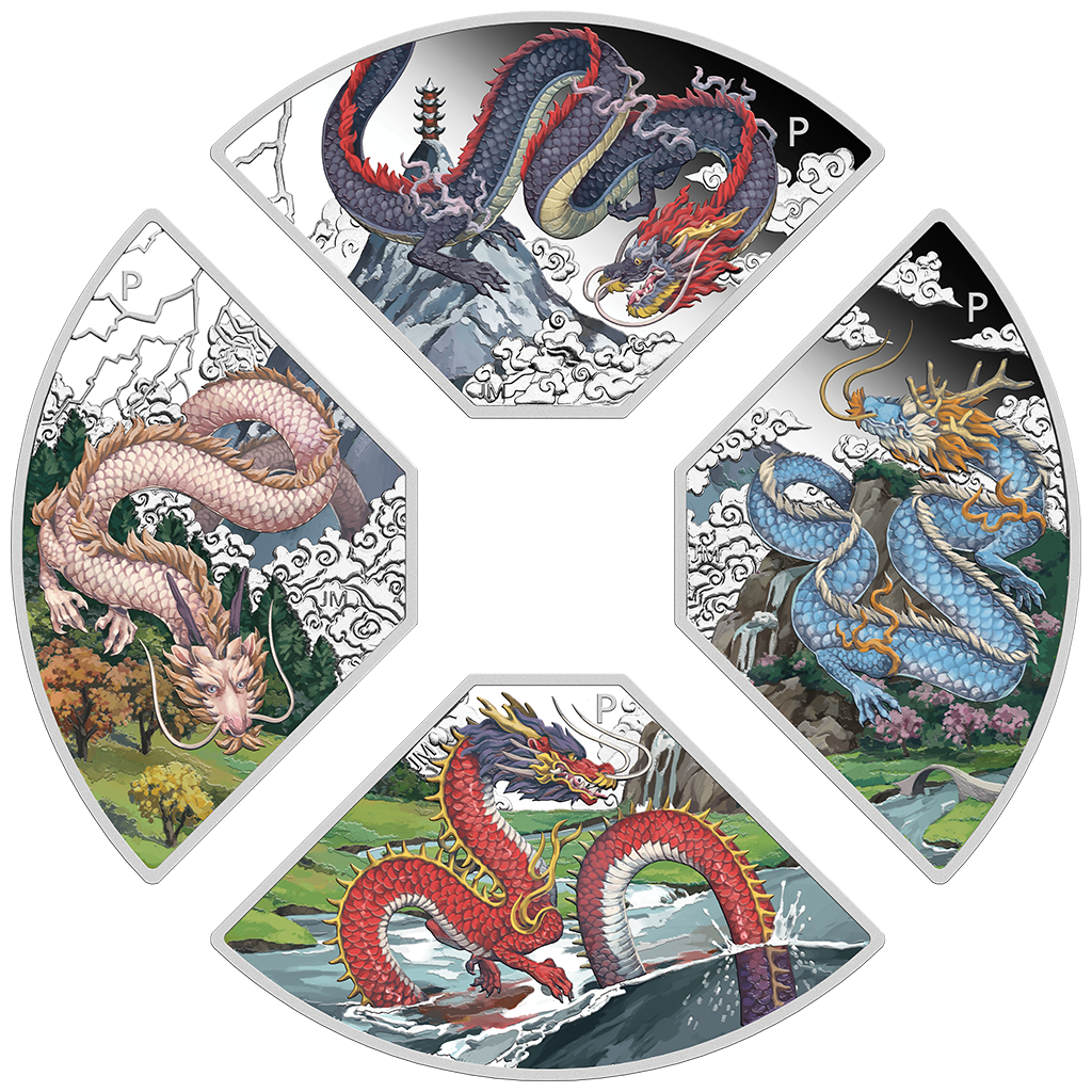 The dragon is significant in traditional Chinese culture as one of 12 animals that participated in the Emperor’s Great Race, held to determine the order of their appearance in the lunar calendar. Celebrating the fifth lunar animal, each coloured quadrant coin portrays a Dragon King from Chinese folklore – Ao Shun, the Black Dragon/Ao Guang, the Azure Dragon/Ao Qin, the Red Dragon/Ao Run, the White Dragon. Together they are presented in the shape of an ancient Chinese ‘ban liang’ coin, the four contemporary pieces picture the dragons in a majestic landscape.