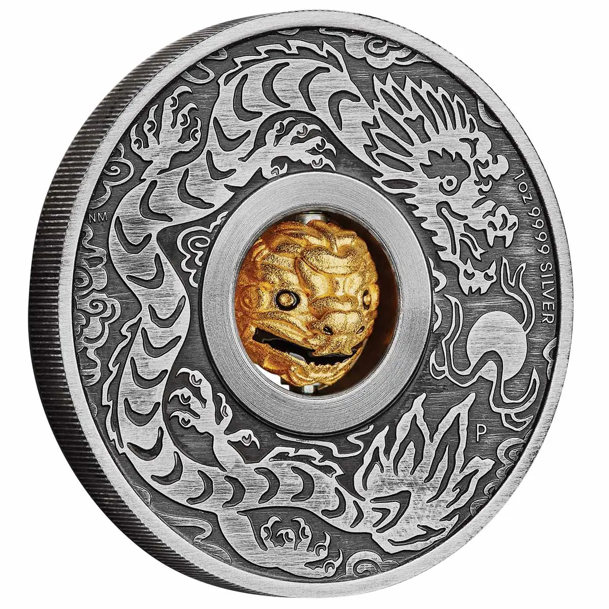 Tuvalu 2024 $1 Lunar Year of The Dragon Rotating Charm 1oz Silver Antiqued Coin