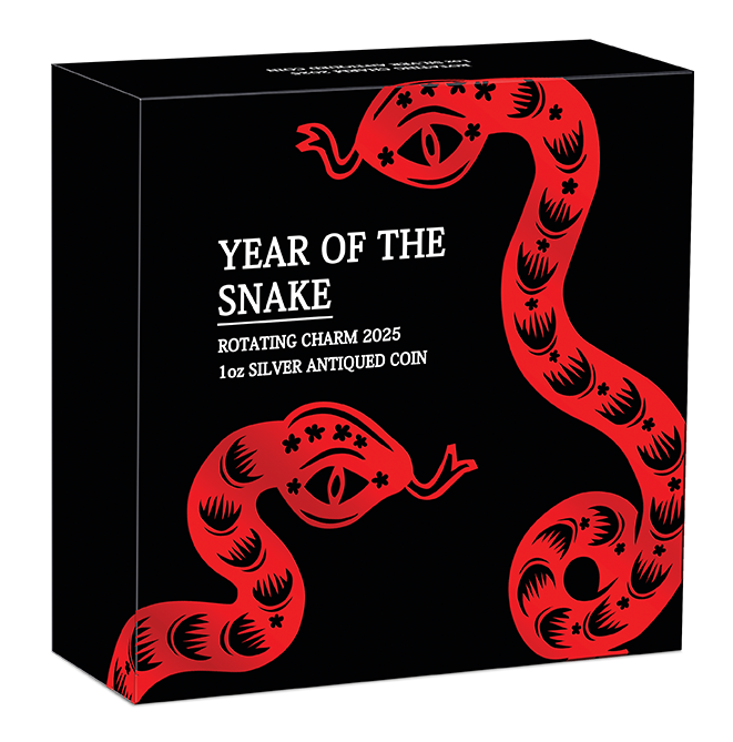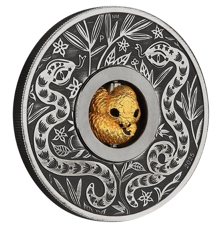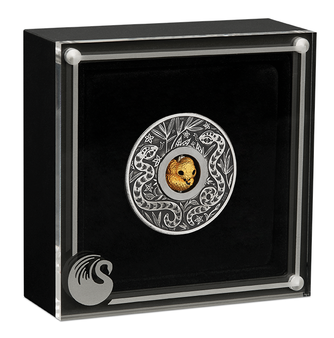 According to tradition, the snake finished sixth in the Emperor’s ‘Great Race’ and subsequently it has represented every sixth year in the 12-year lunar cycle. The coin incorporates a rotating gold-plated sterling silver bead resembling a coiled snake. It is surrounded by a representation of two snakes among stylised foliage. Also included is The Perth Mint’s ‘P’ mintmark.