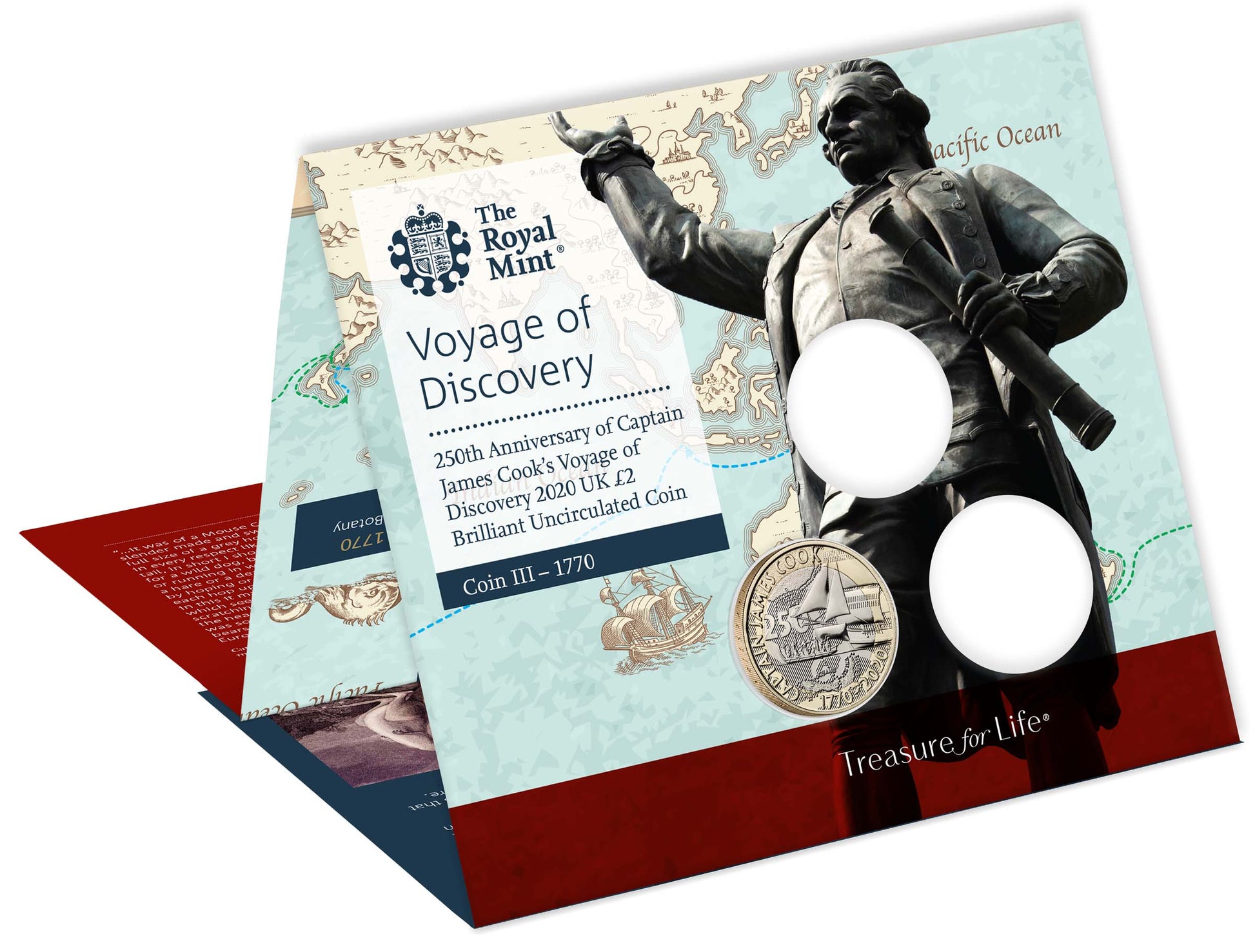 A determined man from a humble background, Captain James Cook expanded scientific and cultural understanding of the world through his pioneering voyages, more than 250 years ago. Part of a unique series this coin celebrates 250 years since Cook's famous voyage to Tahiti and the uncharted lands of the Pacific Ocean. This cupro-nickel with outer nickel brass coin is part of a unique design that spans three £2 coins, released over three years.