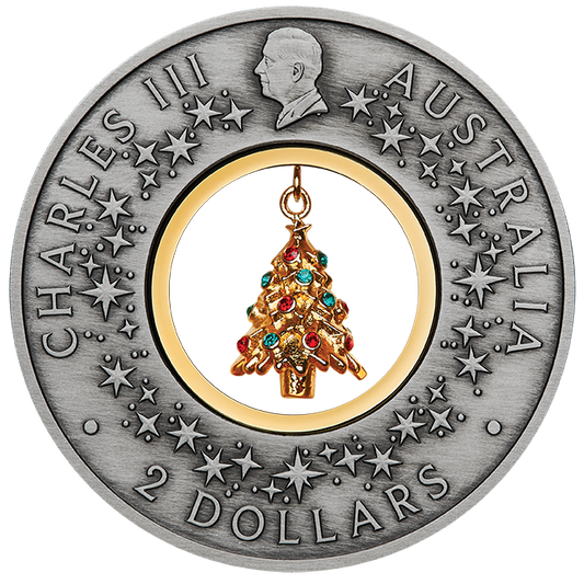 2025 $2 Santa's Workshop with Gold Plated Christmas Tree Charm 2oz Silver Antiqued Coin