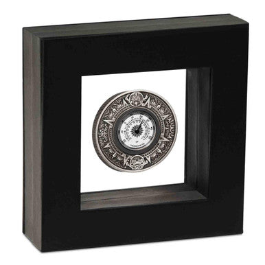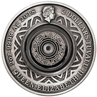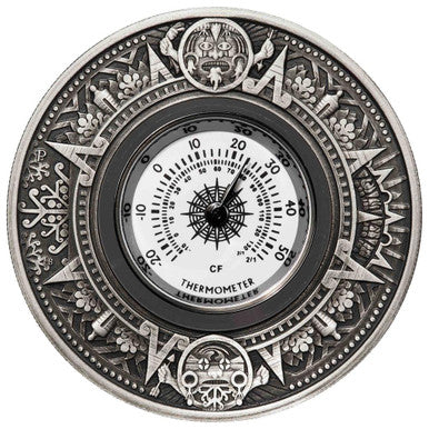 The coin is inset with an operational dial thermometer. Including both Celcius and Fahrenheit scales, the thermometer’s face portrays an Aztec-style sun in the middle. It is then surrounded by Aztec-style patterns and iconography based on the circular Aztec agricultural, or solar, calendar. The fire-breathing sun god Tonatiuh is represented at the top holding an arrow in one hand, a flaming torch the other and wearing flame earrings. At the bottom is Itztlacoliuhqui breathing frost and carrying an arrow. On the left, or cold side of the thermometer dial is an Aztec or Mesoamerican, stylisation of a snowflake. Opposite is a similarly styled depiction of the sun’s rays.