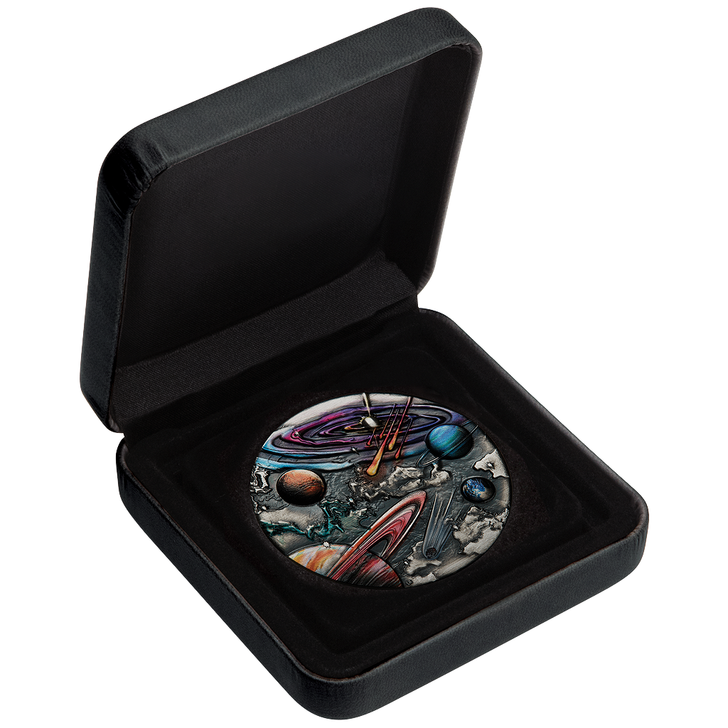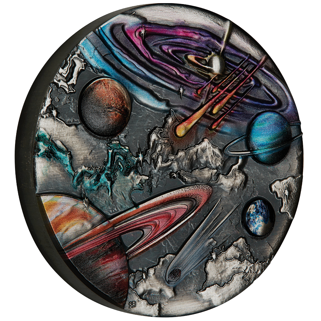 Beyond the Moon, we identified planets and comets in our Solar System, as well as more distant stars and constellations. The invention of the telescope in the early 17th century advanced our understanding of Earth’s place within, the vast cosmos. The coin’s coloured reverse design represents the Universe with an artistic arrangement of astronomical bodies including Earth, fringed planets, comets meteors, stars, a galaxy, and nebulae.